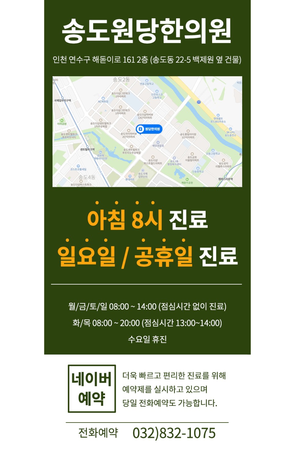 방문 전 미리 예약을 해주시면 보다 원활한 진료가 가능합니다.진료상담 및 예약은 전화로 연락주시면 송도 원내의원으로 안내해 드리겠습니다.